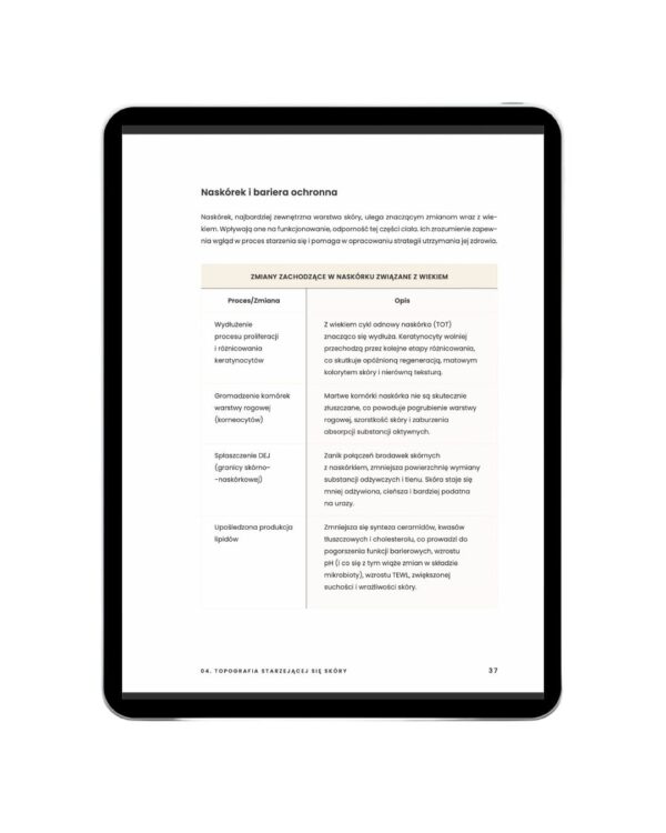 E-book dostarcza praktycznych narzędzi i strategii do pracy ze starzejącą się skórą, uwzględniając wpływ hormonów, stylu życia i zdrowia ogólnego. Publikacja nie tylko edukuje, ale i inspiruje do głębszego, wielowymiarowego podejścia do procesu starzenia się – z troską o wygląd, zdrowie i samopoczucie na każdym etapie życia.